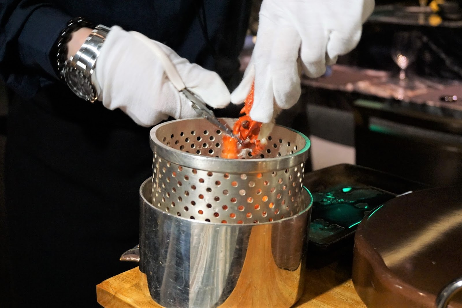據聞,《嘉門鐵板燒》擁有全亞洲唯一一部昆庭龍蝦機,以國際知名銀器品牌製造,全球只有十一部,專門用來製作龍蝦汁,價值百萬,旁邊就是證書。
